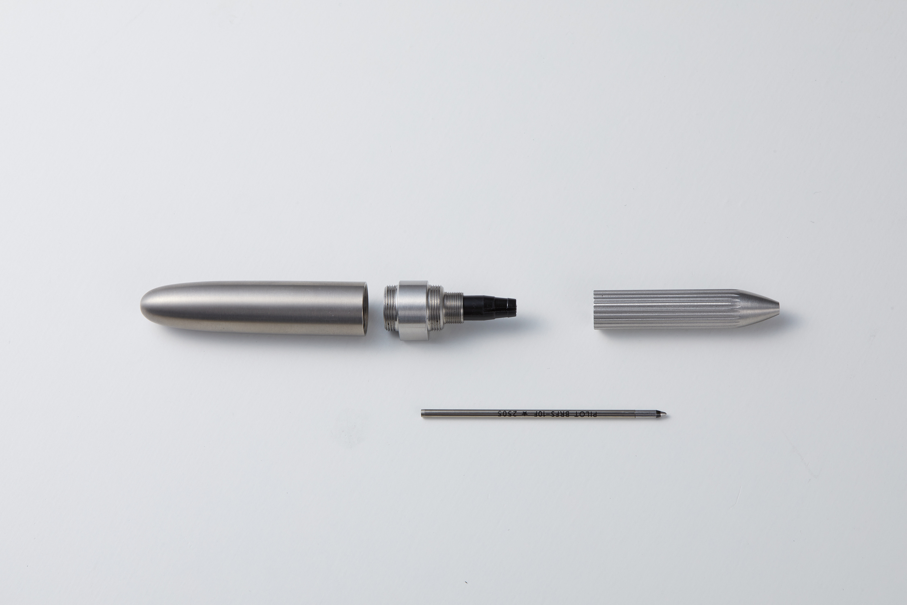筆套內 只有一個零件。將筆芯裝入固定轉接器後放入筆身即可完成,不需調整墊片、不需彈簧、更不必改造筆芯。