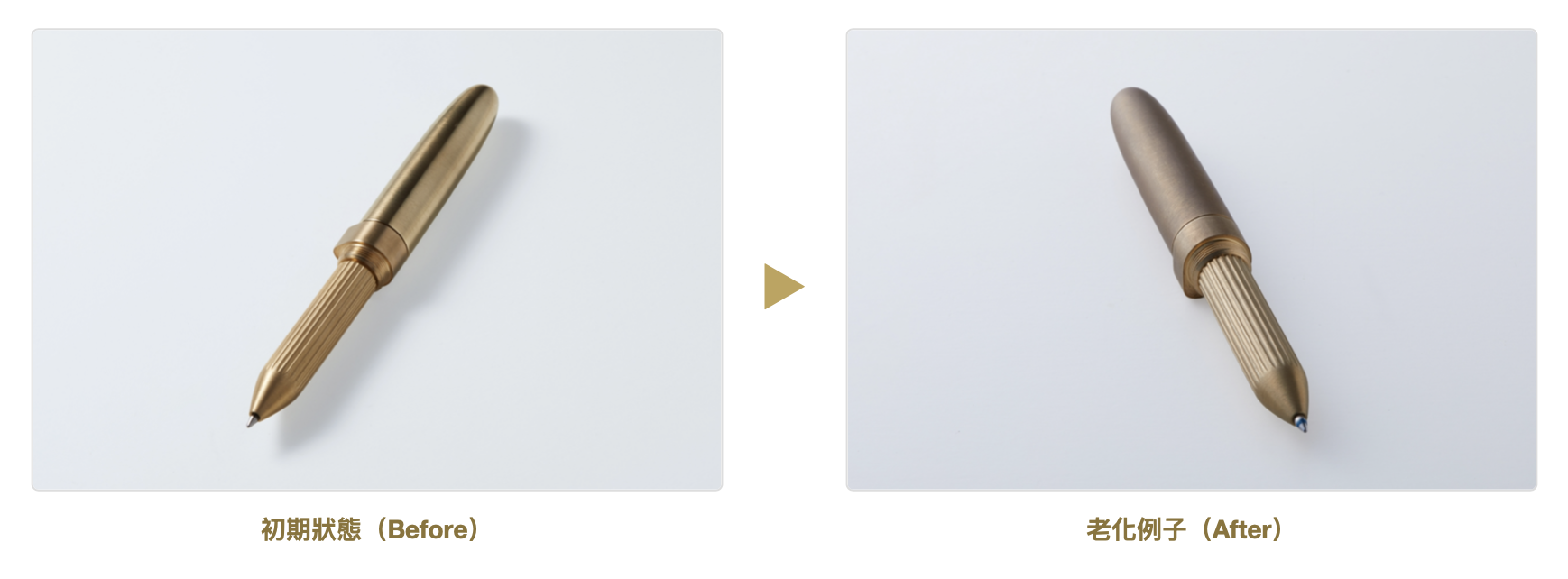 這是一支 經過一段時間使用、開始自然「熟成(Aging)」的黃銅款筆。黃銅部分,刻意未做任何表面處理,隨著使用者的手觸與時間,筆身表面會逐漸變化,產生獨特的風味與歷史感。