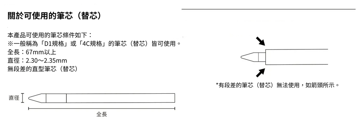適用筆芯:D1、4C(全長 67~xx mm、直徑 2.30~2.35 mm)