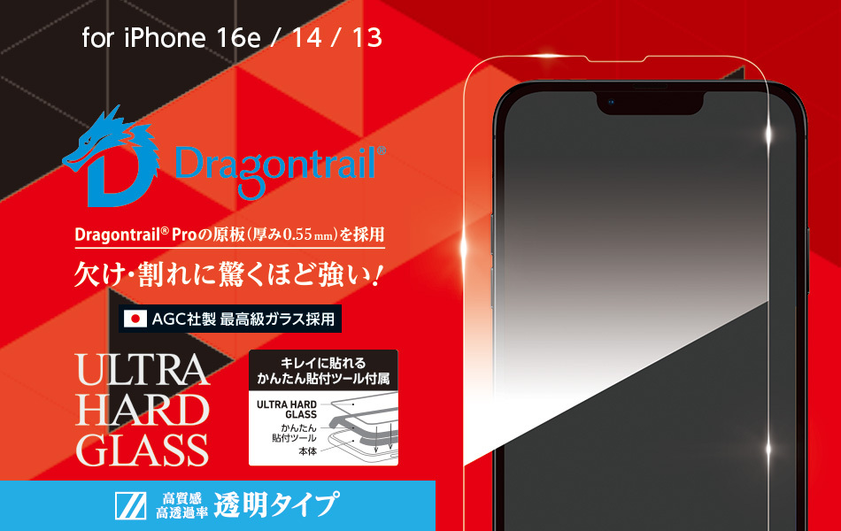 iPhone 16e 專用 「ULTRA HARD GLASS」螢幕玻璃保護貼 厚度0.4mm 8倍硬度超剛性 高透亮 全屏保護 不易破裂 與手機殼相容 使用日本AGC® 「DragonTrail®」二次強化玻璃